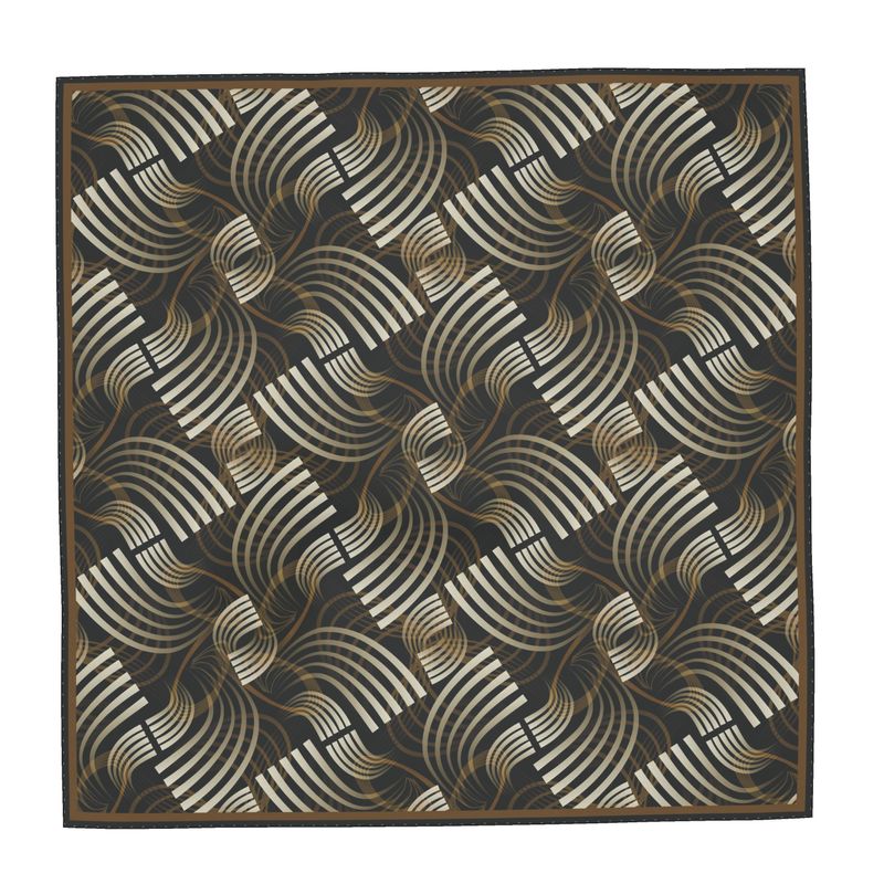 Large square scarf 90cm x 90cm featuring a bold chromatic combination of rhythmically geometric patterns, perhaps a nod to Art Deco with just an undertone of Op-Art, evoking feminine-masculine balance with the neutral monochrome palette and strong structured lines all softened by fluid curves.