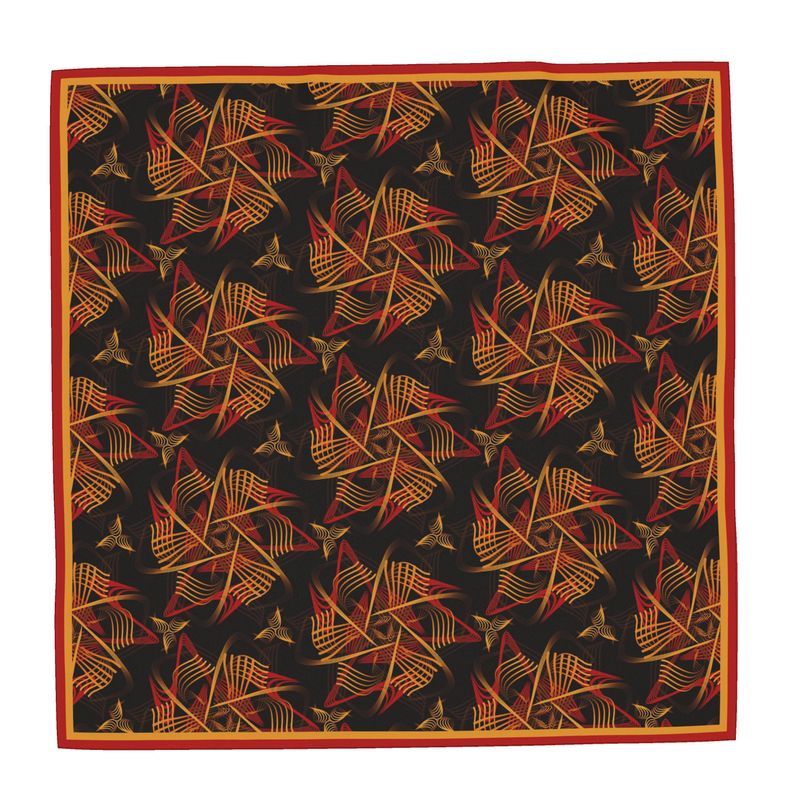 Large silk satin square scarf 90cm x 90cm featuring a bold orange red and yellow repeat pattern evoking memories of sharing tles around a campfire, with fluid filigree srokes and rich black background.