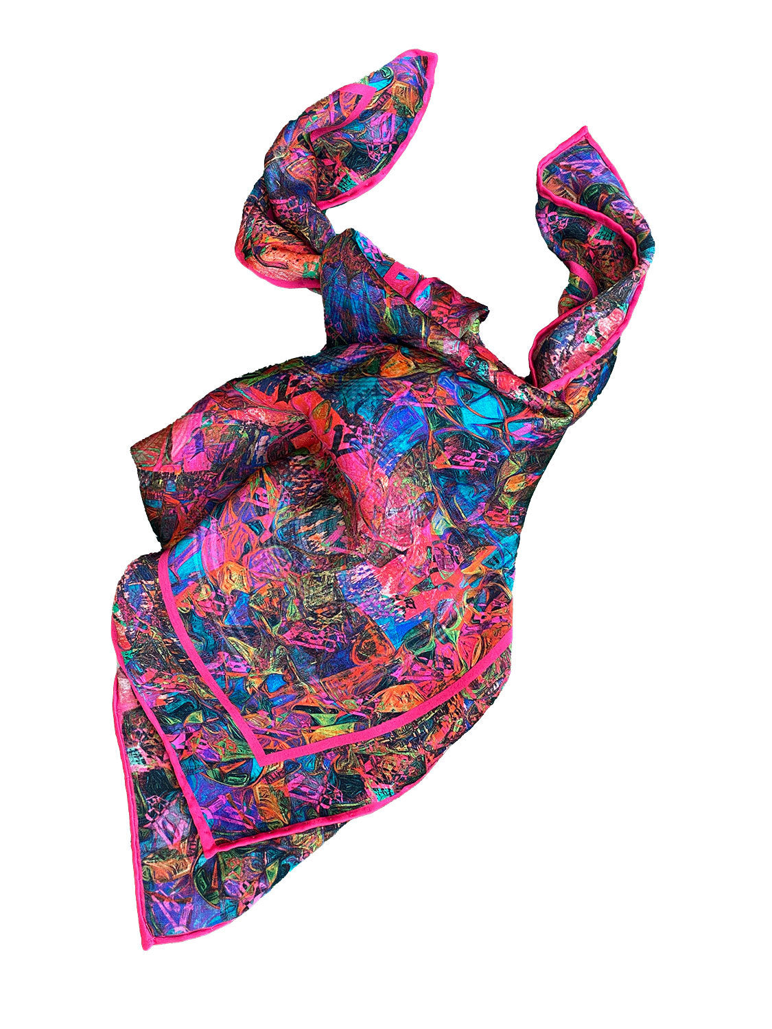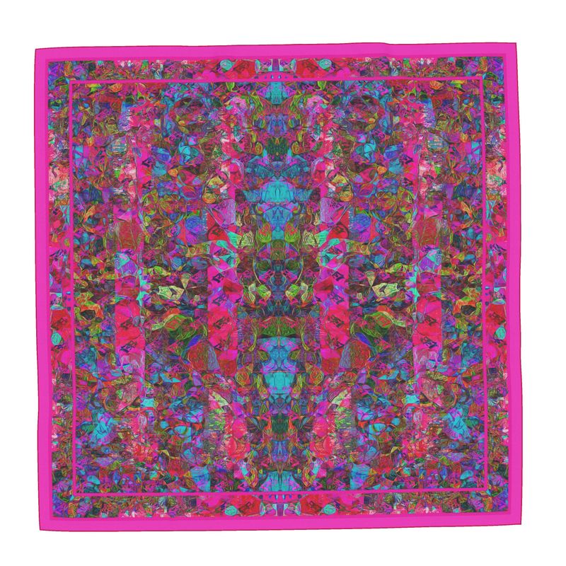 Large silk scarf 90cm x 90cm featuring a design with a luminous, kaleidoscopic energy, with a layered fractal-like symmetry. Perhaps a digital tapestry, with rich luscious pinks, bijou like greens, magentas and electric blues evoke 15th century Levant creating a prismatic depth and swirling motion.